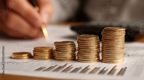 Person analyzing financial growth with stacks of gold coins and a calculator on a chart