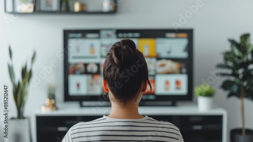 Person browsing a product catalog on a smart TV, representing the versatility of internet marketplace shopping, modern and tech-driven