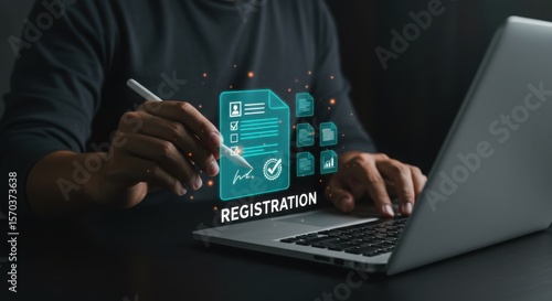 Person completing online registration with a digital signature on a laptop
