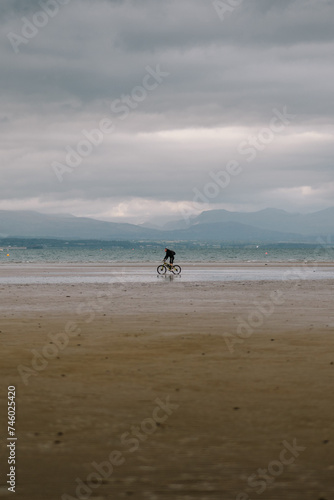 Person cycling on a beach
