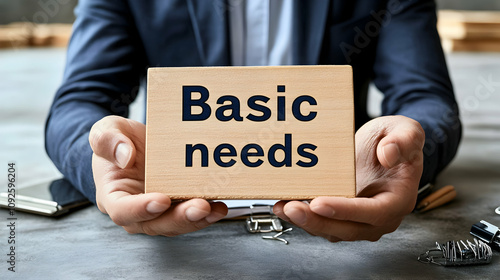 Person Displays Wooden Block with 'Basic Needs' Written on It, Emphasizing Essential Requirements.