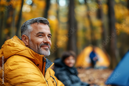 Person enjoying peaceful autumn camping trip in forest with family near tent, generative ai