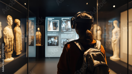 person exploring virtual museum exhibit with headset, surrounded by sculptures and informative displays. atmosphere is immersive and educational, showcasing art and history