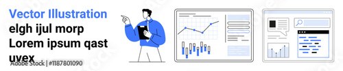 Person holding a clipboard and pointing, bar graphs, line charts, and web layout with metrics. Ideal for business analytics, data visualization, presentation, web design, marketing, reporting