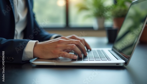 Person in a suit working on a laptop in a modern, well-lit office setting.