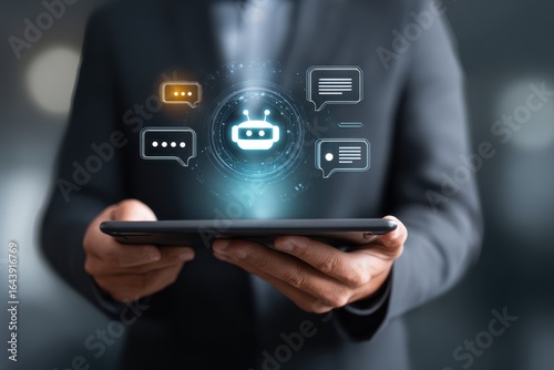 Person in business attire holds tablet while interacting with futuristic chat interface displaying chatbot icons