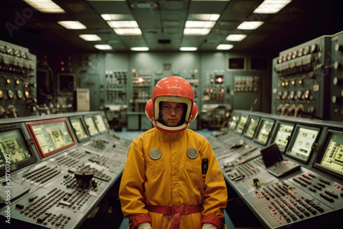 Person in hazmat suit with gas mask in industrial facility, concept of safety and protection