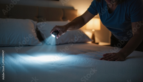 Person inspecting bed with flashlight for pests in dark bedroom setting, Disinsection theme