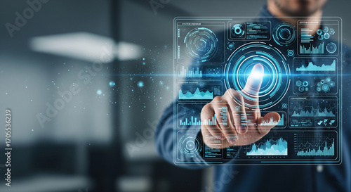Person interacting with a digital hud display system. Ideal for technology companies ads, presentations, and articles. Shows a person using an interactive digital hud display system. Vibrant and futur