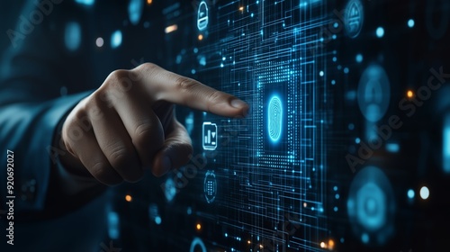 Person interacting with a digital interface featuring blue circuitry and biometric data in a modern technology setting