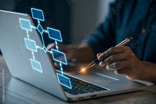 Person interacting with a glowing digital flowchart on a laptop screen