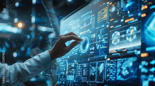 Person interacting with futuristic digital interface, analyzing data visualizations and graphs in a high-tech environment.