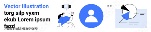 Person interacting with gadgets, user profile icon, pie chart data infographic. Ideal for technology, analytics, user interface, education, marketing, social media simple landing page