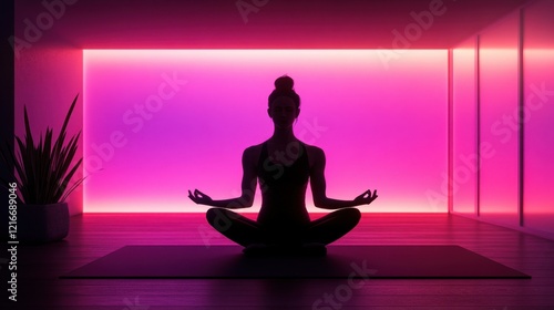 Person is meditating in a room with a vibrant pink gradient background, featuring a plant on the side