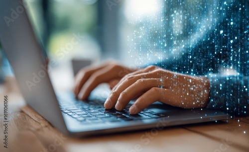 Person is typing on a laptop with a blue screen behind them. The blue screen is filled with a lot of small dots