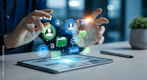 Person managing digital workspace with interactive UI for team collaboration and file organization