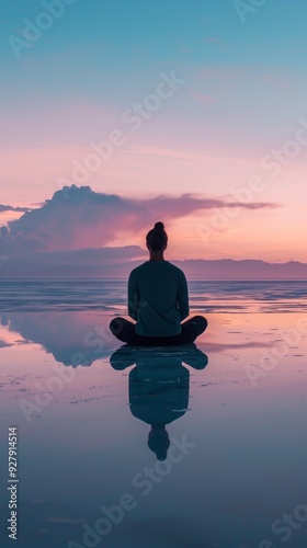 Person Meditating on Reflective Beach at Sunset with Pink and Blue Sky
