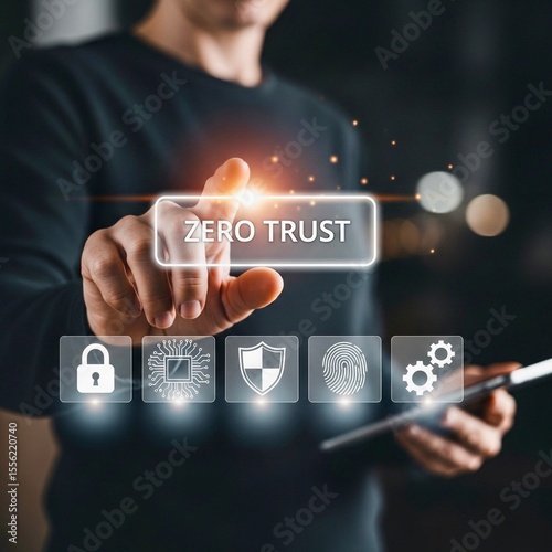 Person points at "ZERO TRUST" bar, surrounded by security icons (padlock, circuit, shield, fingerprint, gears), holding a tablet.