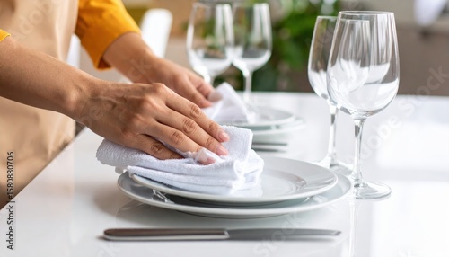 Person setting a dining table with plates and glasses, preparing for a meal in a bright setting