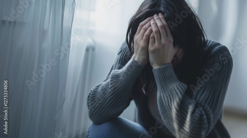 Person sitting alone in a room, holding head with both hands, showing deep emotional distress and inner turmoil, isolated and contemplative moment.