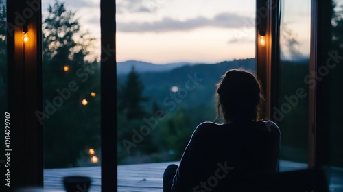 Person sitting in a cozy room gazing at the sunset through large glass windows in a tranquil setting : Generative AI