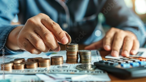 person stacking coins into piles, a budget planner and a calculator beside them,