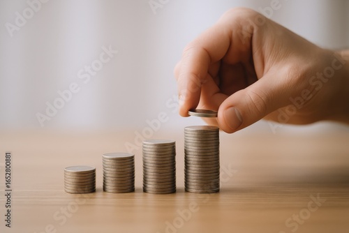 Person Stacking Coins to Represent Financial Growth, Investment Success and Savings Accumulation on Wooden Surface