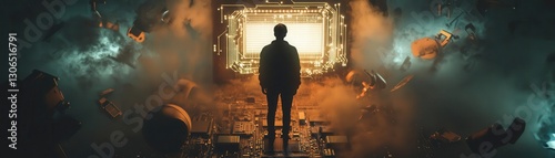 Person Standing Before Futuristic Interface Surrounded by Technology