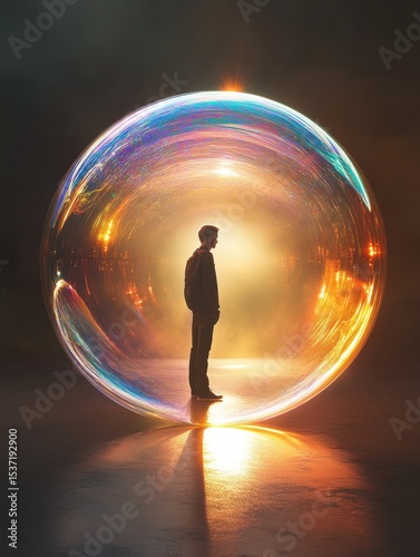 person standing inside a bubble of light, symbolizing protection from negativity, conceptual photography, copy space