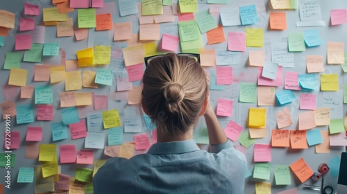 Person stands in front of a wall filled with colorful sticky notes, representing the chaos and stress of multitasking and time management in a busy work environment