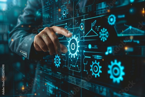 Person touching button on screen with many gears