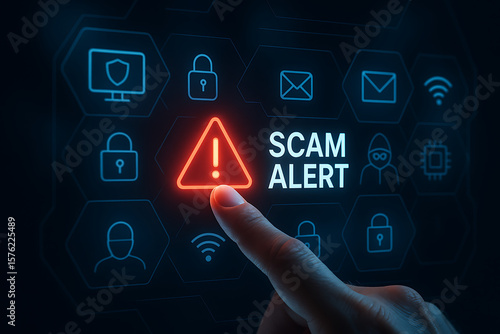 Person touching scam alert icon on blue digital interface, symbolizing online fraud detection and digital security awareness, scam alert, online scam warning, digital fraud, cybersecurity alert,