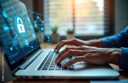 Person types on laptop. Laptop screen displays VPN icon with security symbols. Person using tech for private connection. Illustration online safety concept. Secure data transfer via network
