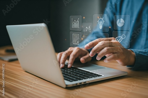Person typing on a laptop with digital icons floating above the keyboard.