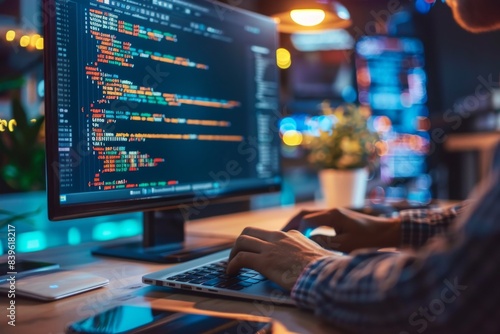 Person typing on computer keyboard by monitor