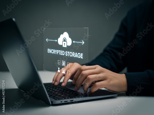 Person typing on laptop with digital cloud storage interface hands