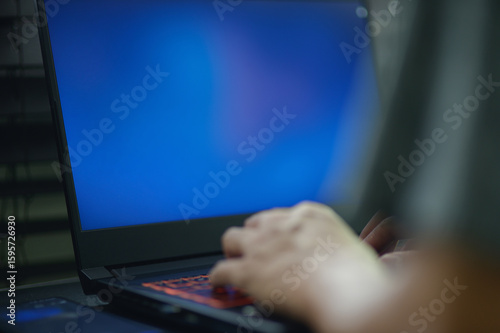 Person Typing on Laptop with Empty Screen in Dimly Lit Environment