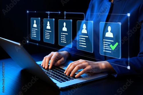 Person using a laptop to manage a digital workflow of candidate profiles with a green checkmark indicating a successful selection in a modern interface