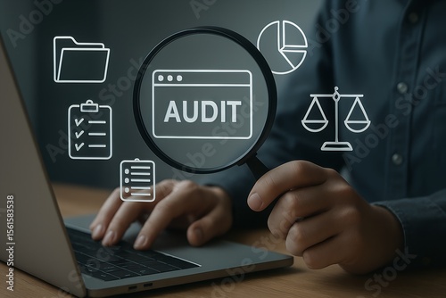 Person using a laptop with icons representing audit process data analysis and legal compliance
