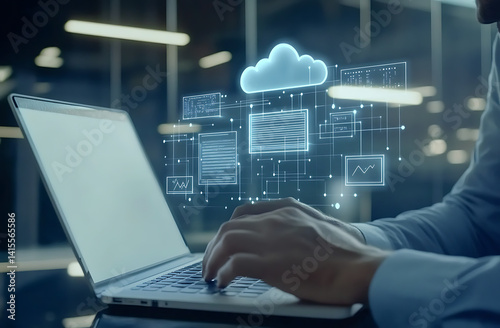 Person using laptop with cloud computing data network interface