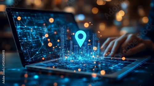 Person Using Laptop with Digital Map and Network Connections, A person typing on a laptop with a digital map and location pin on the screen