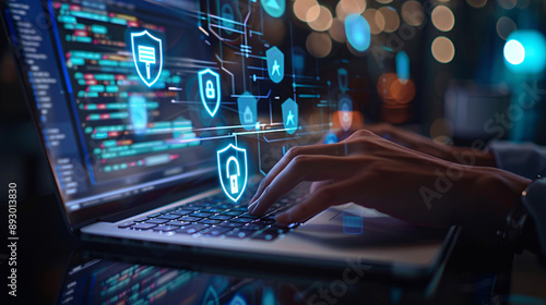 Person using laptop with glowing security icons for cybersecurity, online protection, data privacy, internet safety concepts in digital marketing.