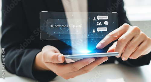 Person using smartphone with holographic chat interface and message bubble icons displayed above it