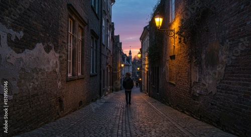 Person Walking Down a Narrow Cobblestone Alley at Twilight