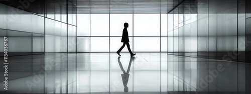 Person walking silently through modern glass corridor urban space minimalist design professional environment side view reflection concept