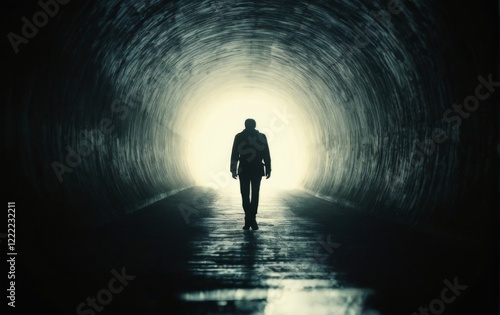 Person walking through illuminated concrete tunnel towards bright light, creating dappled effect; somber and contemplative mood.