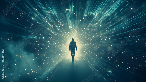 Person Walking Towards Bright Light with Starry Background and Radiating Light Effects in Cosmic Scene Capturing Journey of Discovery and Transformation