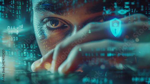 Person wearing a hoodie and mask representing anonymity, a blurred background of binary code