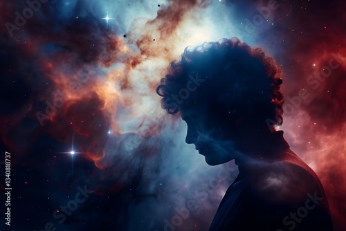 person with curly hair in a cosmic nebula background, depicting a dreamy and otherworldly atmosphere