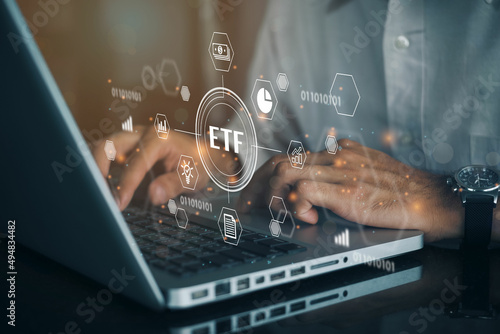 Person working on computer with icons of ETF Exchange traded fund stock market trading investment financial concept.